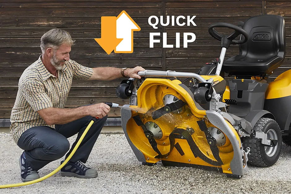 mand vipper klippeaggregat op i serviceposition hvorpå han vasker knivene med en haveslange