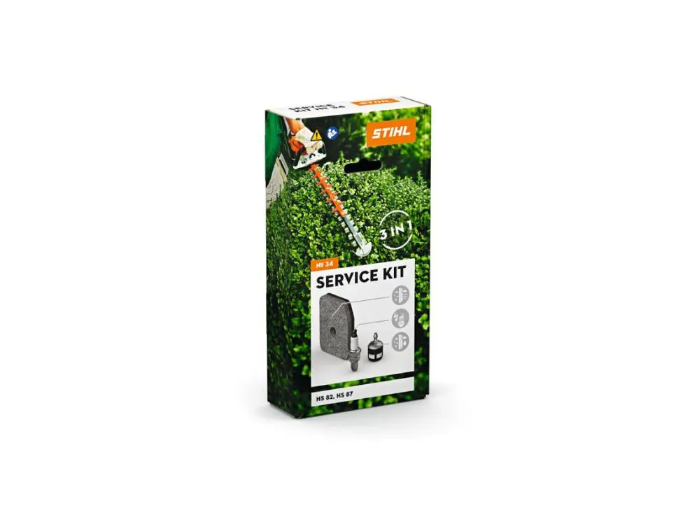 Det praktiske STIHL servicekit 34 indeholder 1 x tændrør, 1 x luftfilter og 1 x brændstoffilter – Perfekt, når din hækkeklipper skal serviceres.