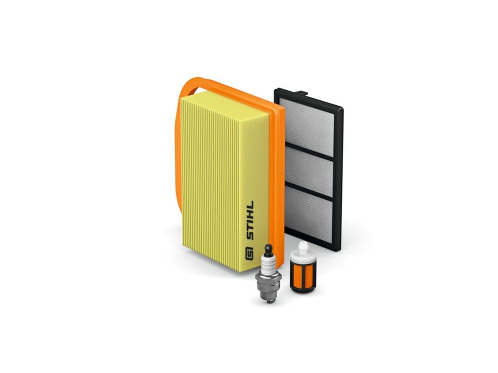 Originalt servicekit fra STIHL med tændrør, luftfilter og brændstoffilter.